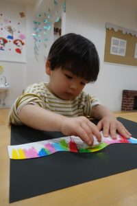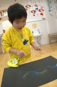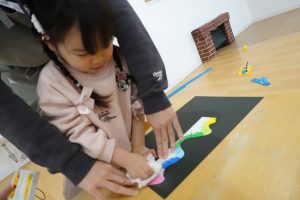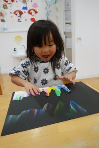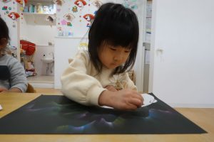 切れたら丸めたティッシュペーパーでクレヨンをこすって黒い画用紙に色を写していきます!