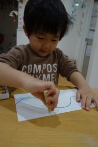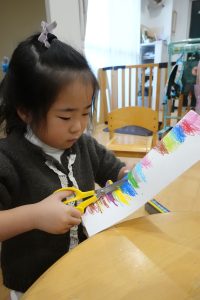 まずは、オーロラのなみなみの線を書いた画用紙に好きな色のクレヨンで色を塗っていきます!大きいお子様には自分でなみなみも描いてもらいました✍
