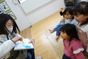 やり方を説明しながら描いてみると「わぁ~めっちゃきれい~✨」「やってみたい!!」と興味津々のお子様たち。