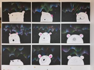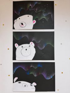 前に描いたしろくまを貼って、キラキラのお星様をちりばめたらきれいなオーロラの絵の完成です✨