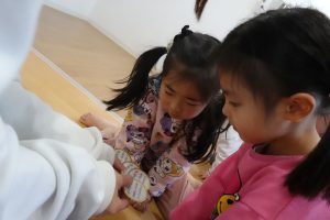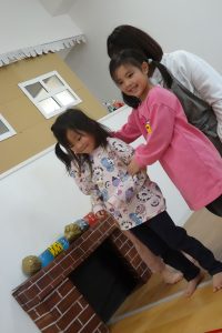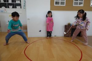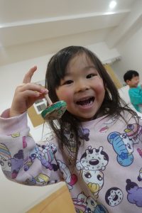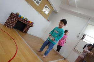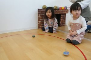 今週月曜日、体調不良でお休みしていたお子様たちが復活し久しぶりに全員揃ったので、第二回こま回し大会を行いました♪