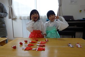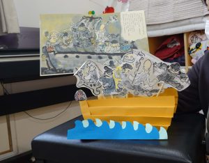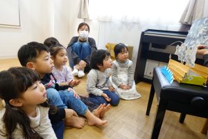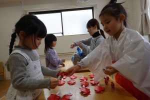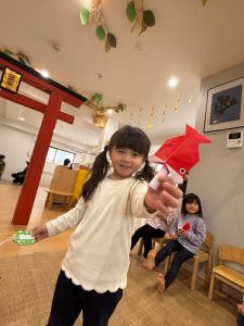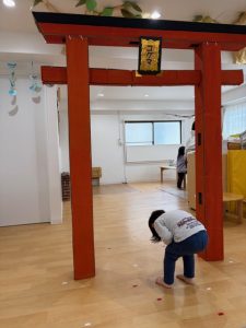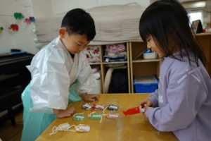 まず、えびすさんを知るために七福神のお話をしました。少し難しい内容だったのでペープサートを使ってお話をしましたよ。