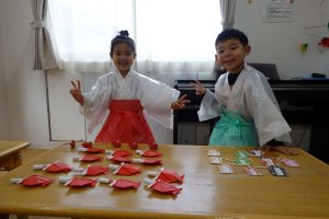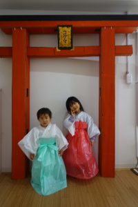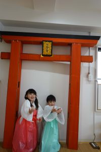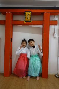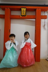 巫女(みこ)と禰宜(ねぎ)の衣装に着替えて、参拝客を出迎え、おみくじ、おまもりを売るお手伝い♪