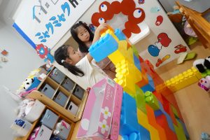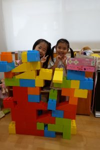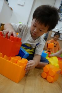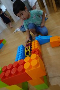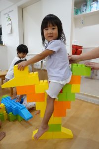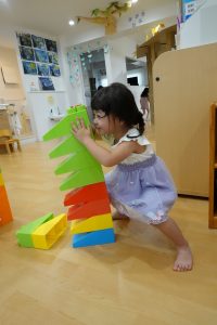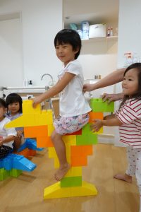 初めはブロックを確保するのに必死のお子さまたち!!「ぼくの!!」「わたしの!!」「この色がいいな」と自分のテリトリーに置いて積み重ねて個々に遊んでいたお子さまたちでしたが💦(笑)