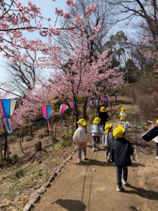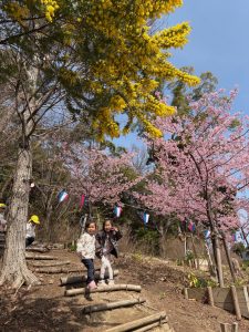 公園に到着すると、河津桜が咲いている様子が外からも見えました🌸