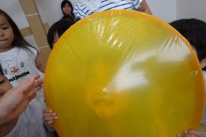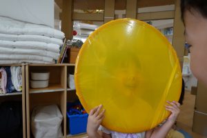 フープにカラーポリ袋をつけてまん丸お月さまを作りました🌕