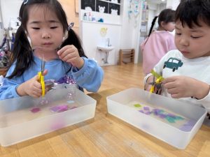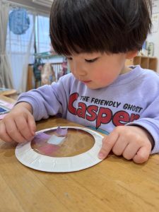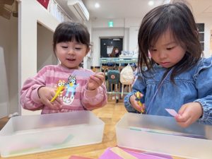 セロハンなので少し切りにくかったのですが、大きく刃を開いて切ると切りやすいということを発見して嬉しそうに報告してくれるお子様もいました👏✨