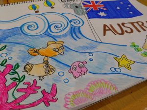 お子さまにオーストラリアを紹介するスケッチブックにニモの絵を描いてもらいました🐟かわいく描けました👏