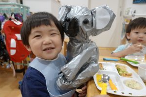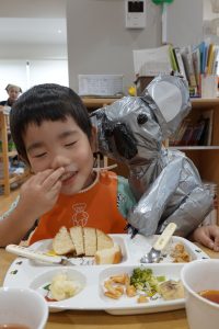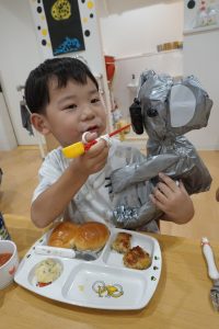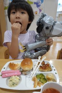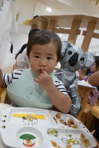 美味しい!と食べていたら、やってきましたコアラさん🐨💕いつもユーカリの葉っぱを食べていますが、コグマの美味しい給食を食べたいようで、みんなにくっついていました🐨