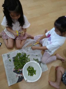 その枝豆のさやをはさみで切るお手伝いをしてもらいましたよ🫛