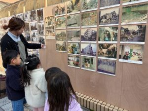 建物が崩壊したり、線路が曲がっていたり、「こんなになるの?こわいね・・・。」とじっと写真を眺めていました。