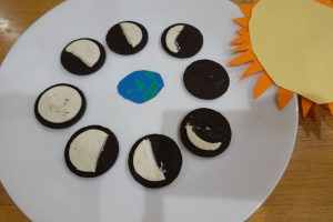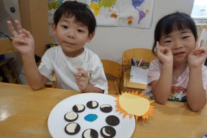 月曜日のお月見イベントに向けて、お月さまに興味がもてるようにいろんな遊びをしましたよ🌕今日は、お菓子のオレオで美味しく月の満ち欠けを学びました🌕🍪