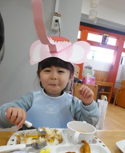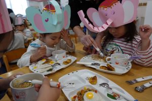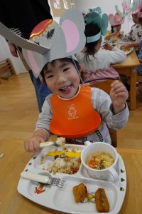 ゾウさんお面をつけたまま「いただきまーす♪」