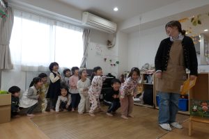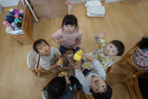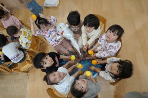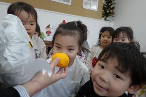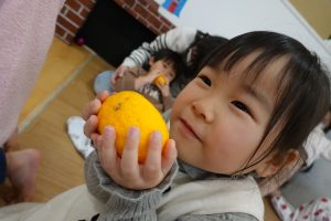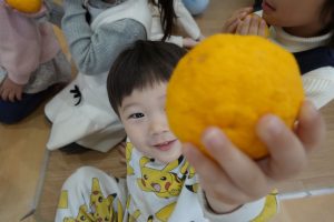 と朝の会でお子さまに冬至のお話しをしました🍊ゆず湯に入ると、風邪をひかず元気で過ごせるお話もしました🍊