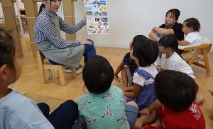 真っ青に光る海の写真を見せ「これ全~部、イカが光っているんだよ!」というと「えー?!」「海が光ってる✨」「見てみたーい!!」と言っていました🦑