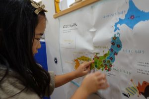 滋賀県の場所にシールを貼ります✨地図でも琵琶湖を確認しました😊