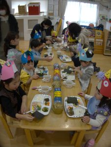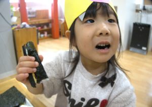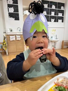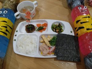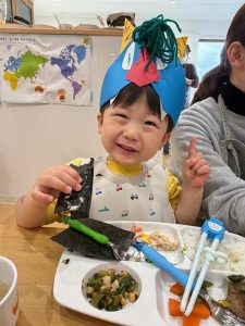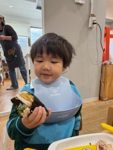 ちびおにちゃんから、おともだちだよ♡のお手紙をもらい嬉しそうなお子様たち♡豆まきでちょっとぐったり?でしたが、美味しい節分給食でも、にっこり笑顔に😊♡節分給食では、いわし豆腐ハンバーグ・小松菜と大豆のかつお昆布風味・鬼除け汁と鬼がギャーと逃げていくものを食事でも♪そして、今年はなんと!手巻き寿司が出ました♪