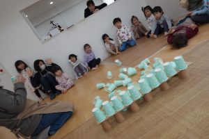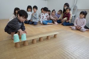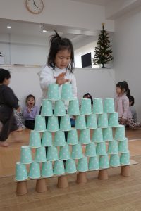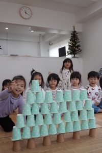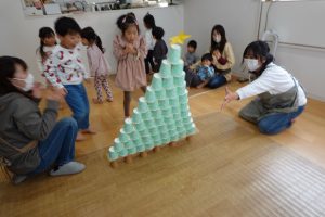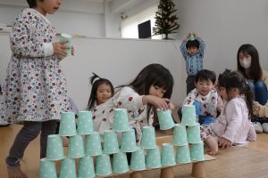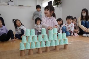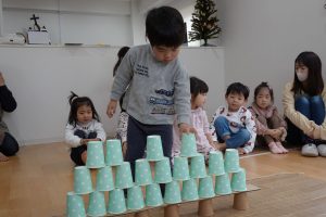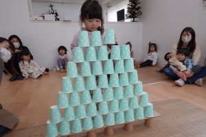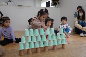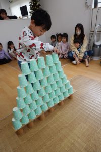 2段目、コップとコップの間に積んでいきます!上に重ねてしまうお子さまもいましたが、大きいお友だちがお見本のように上手に積んでいくのを見て小さいお友だちもまねして積んでいました😊