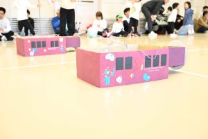 風船を膨らまし、親子で電車で運んで、青い何か…のパネルに貼りつけていきます!