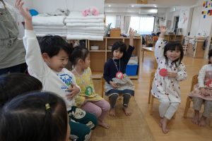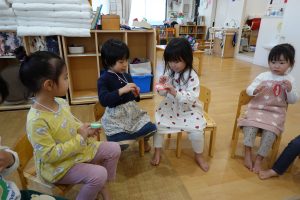 自分がどちらか分かるようにイラスト付きのメダルを付けると、お友だちと嬉しそうに見せ合いっこしていました💕