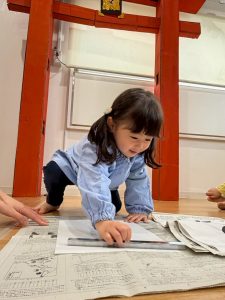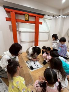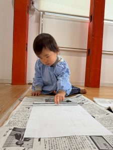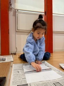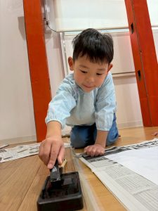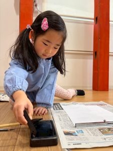 まずは道具の名前と使い方を覚えます。聞き馴染みのない名前でしたが「ぶんちんー!」「すずりー!!」と楽しそうにスタッフに続いて言っていました♪