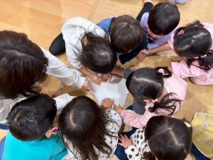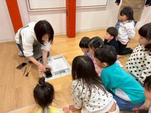 身体を前のめりにしながらじっと見つめるお子様たち。書き終えると「すごーい!じょうずー👏✨」と拍手を送っていました😊