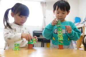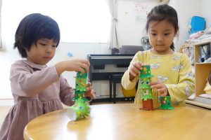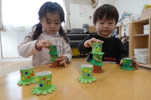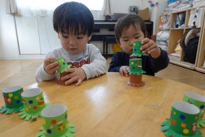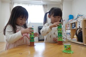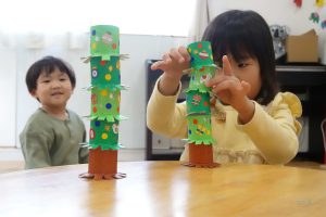 みんなも高~いクリスマスツリーを作ってみよう!ということで、ツリーを積む遊びをしました🎄