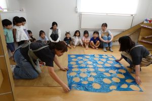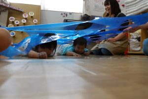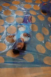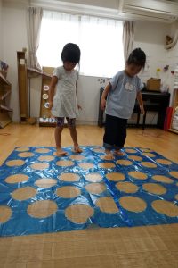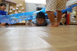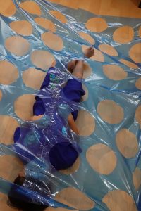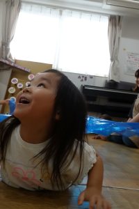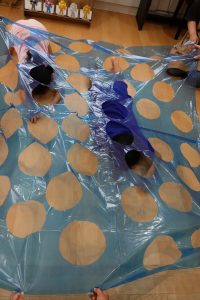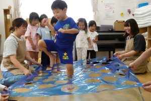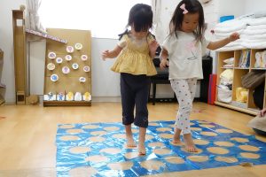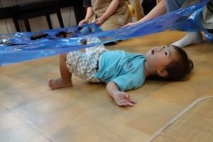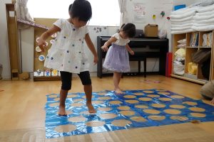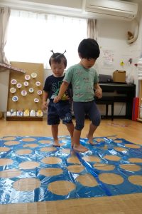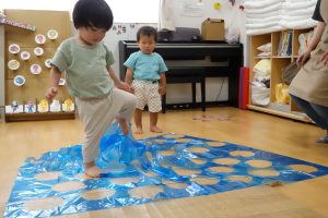 小さいお友だちには難しかったようで、カラーポリ袋が足にくっついてしまい”あれれれれ?””なんだなんだ?”と不思議そう😲