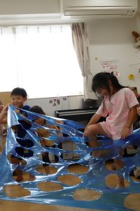カラーポリ袋に丸い穴を複数開けたもので遊びました🔵🔵