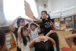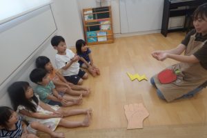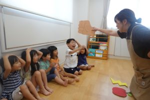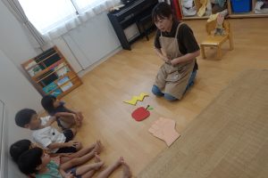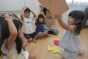 スタッフやお友だちの話す言葉を集中してよーく聞くこと、落ちてくるものを想像し、想像力や表現力をつけることができる楽しい遊びです🍎⚡✊