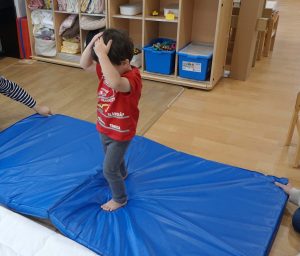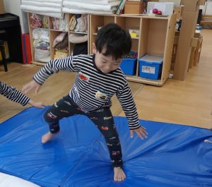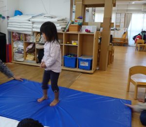 実際に揺れたらどんな風になるのか体験してみよう。とマットに一人ずつ乗って、揺らしてみました。