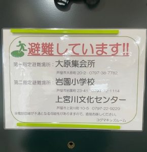 避難場所は、玄関ドアに貼ってあります。お子さまにも、「避難する場所がドアに貼っていることを保護者の方に教えてね。」と伝えると、お迎え時に、「ドア見て!」と伝えてくれていましたよ。