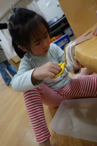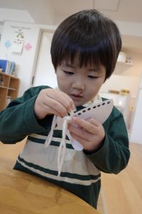 毛糸の先がふにゃふにゃしてしまい、なかなか穴の中に通せず苦戦する時もありましたが、先をテープで固定するとスムーズに入れることが出来、お子様も夢中になってやっていました😊🎶