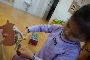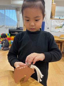 お馬さんのたてがみの毛糸は自分で選びました。1種類のお子様もいれば、混ぜてみたいと2種類の毛糸を選ぶお子様もいました😊