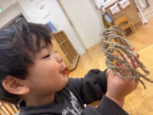 選んだ毛糸を小さい穴に2重にして通すので、少し難しいのです💦大きいお友達も真剣な表情で頑張って通していました💪💪