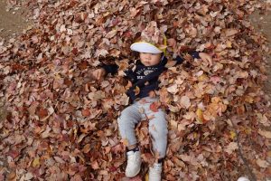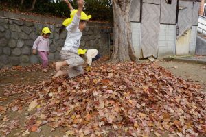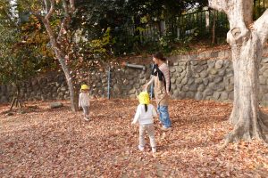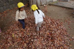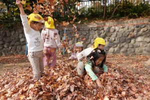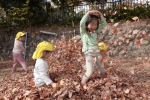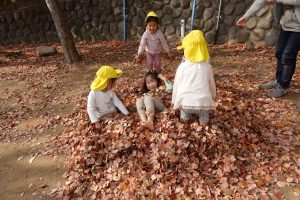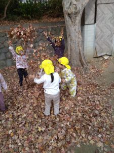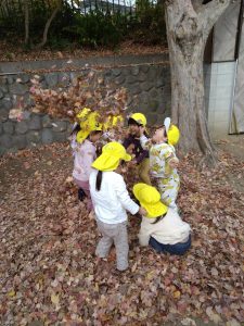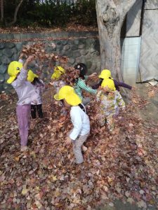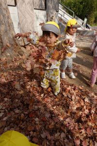すごーい!!わーーー!!!と早速、落ち葉を集めて投げて遊んだり、カサカサ♪踏んで落ち葉の音を楽しんだりするお子さまたち。